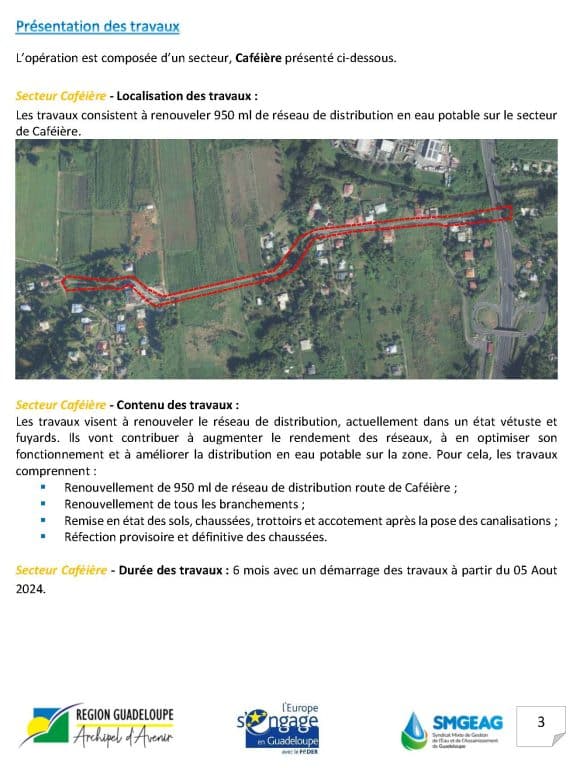 Dans le cadre de la feuille de route concertée du projet de contrat d’accompagnement renforcé du SMGEAG, la Région Guadeloupe porte un ensemble d’actions dont des opérations prioritaires de renouvellement de réseaux qui doivent contribuer à l’amélioration de la distribution en eau potable.