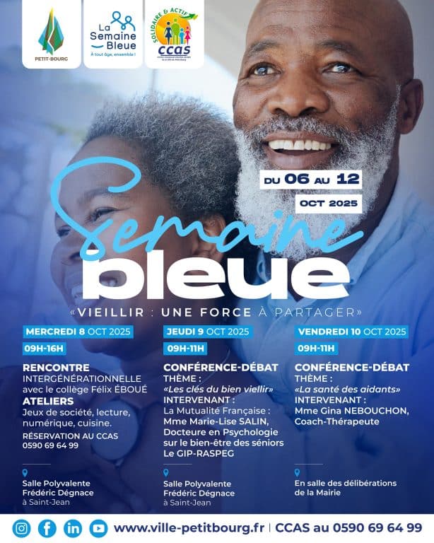 La Ville de Petit-Bourg s’associe à la Semaine nationale des retraités et des personnes âgées, plus connue sous le nom de Semaine Bleue, qui se déroulera du 6 au 12 octobre 2025. Cette édition, placée sous le thème « Vieillir : une force à partager », met à l’honneur la place des aînés dans la société et encourage le dialogue entre les générations.