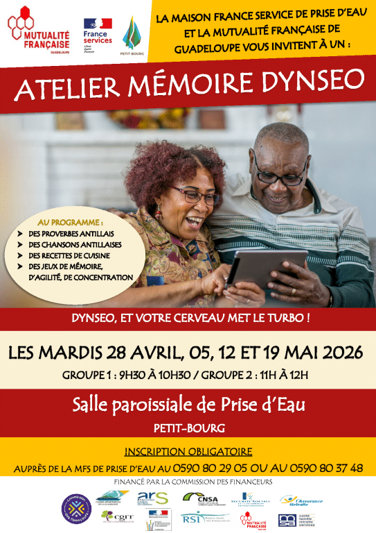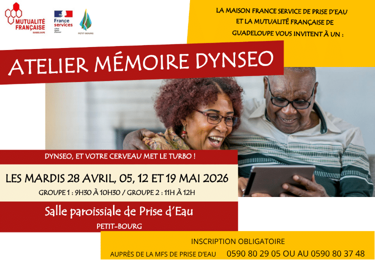 La Maison France Service de Prise d’Eau Petit-Bourg, en partenariat avec la Mutualité Française de Guadeloupe, informe la population de l’organisation d’un atelier mémoire DYNSEO qui se déroulera :