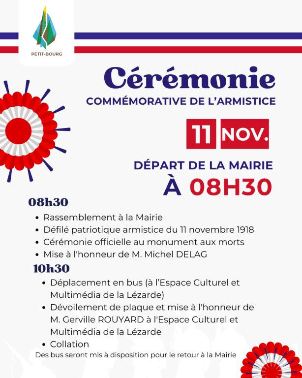 Ce lundi 11 novembre, la Ville de Petit-Bourg vous invite à participer à la cérémonie commémorative de l’Armistice de 1918, en hommage à celles et ceux qui ont donné leur vie pour la France.