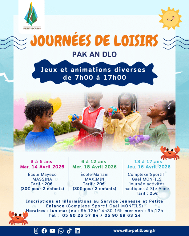 La Ville de Petit-Bourg met en place un nouveau dispositif à destination des enfants et des jeunes : les Journées de Loisirs “Pak an dlo”. Une initiative pensée pour offrir des moments de détente, de découverte et de convivialité pendant les vacances scolaires.
